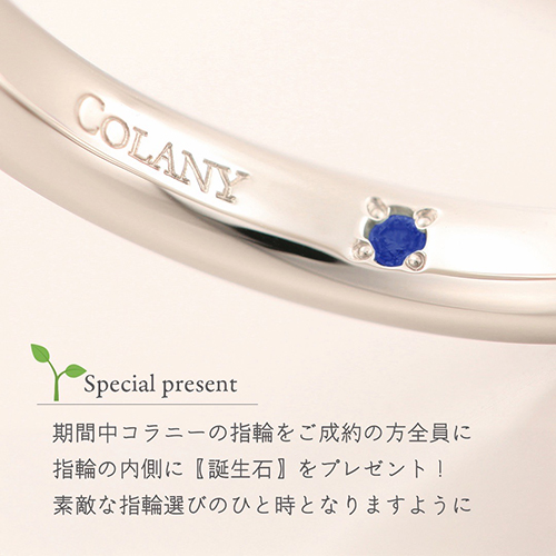 期間中はプロが選んだブライダルブランド「COLANY」のご成約特典として、リング内側への誕生石セッティングをプレゼントいたします。