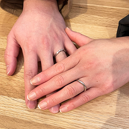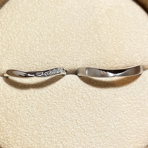 アレンジも豊富で彼女様は半分ダイヤモンド、彼氏様は艶消しベースにキラリと鏡面。