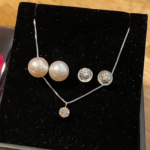 ダイヤモンドとパールのイヤリングを、今は遠く離れて住んでいる娘さんのためにピアスに作り替えました。