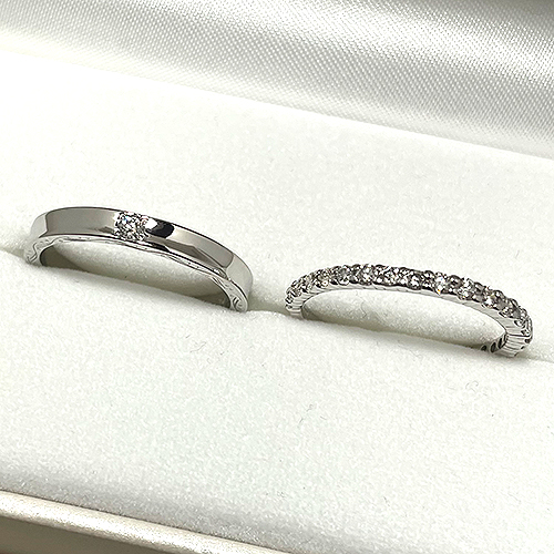 結婚指輪は頂点部分が折れかかっておりダイヤモンドを留めている部分が破損、エタニティリングはダイヤモンドが2石外れておりました。